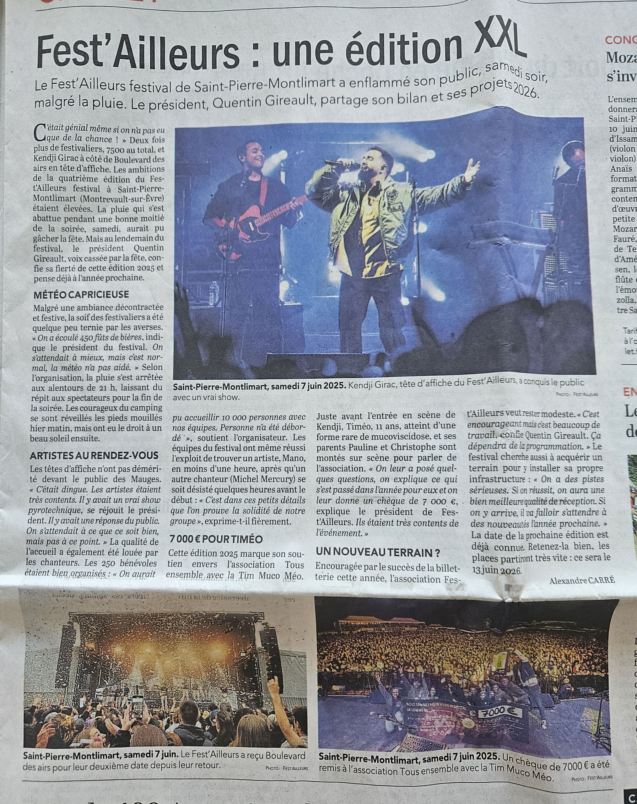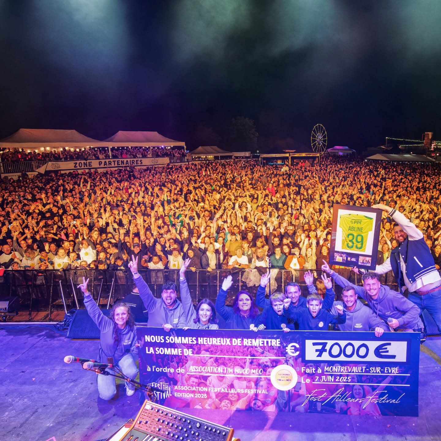 Lors de cette soirée, nous avons pu sensibiliser 7500 festivaliers , et parler de notre association. Un moment gravé lorsque le public a acclamé Timéo, et lorsque le maillot de foot de Mathis Abline a été offert par l’équipe de Fest’Ailleurs.